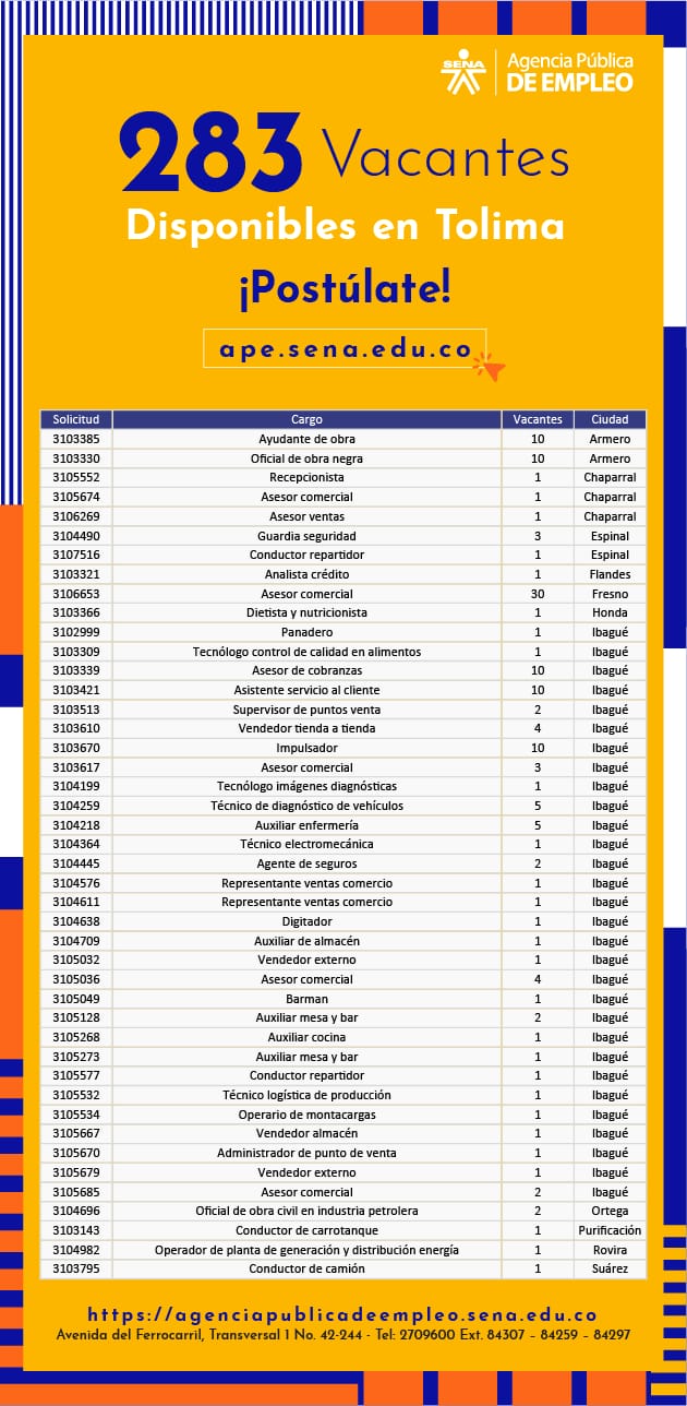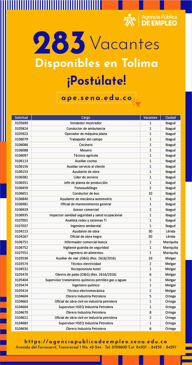 #EmpleoSiHay| La Agencia del empleo del Sena Tolima, publicó el listado de vacantes en diversos municipios del Tolima, con los perfiles que deben reunir los aspirantes a los cargos. Aquí pueden consultar los listados.
