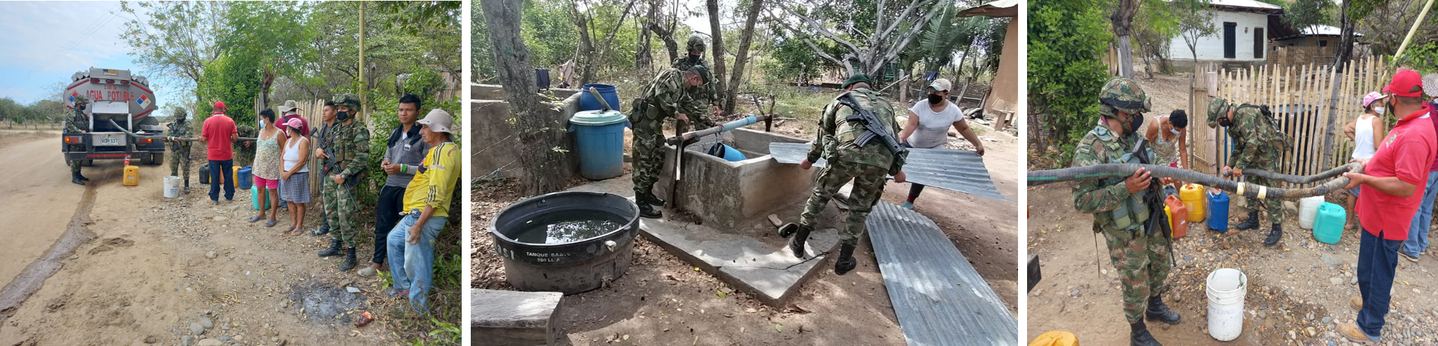 Desde hace una semana Soldados del Batallón de Operaciones Terrestres n. 17, Batallón de Apoyos y Servicios para el Combate n. 06 de la Sexta Brigada del Ejército Nacional, llegan con el carro tanque con agua a los resguardos indígenas Santa Marta, Santa Marta Diamante, Santa Marta Palmar, Palmar Alto, Bocas de Baby y Mina de Cobre del municipio de Coyaima con más de 50 mil litros del preciado líquido.