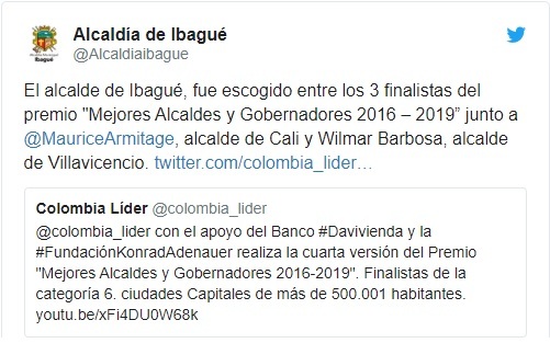 En su cuenta de twiter, el mandatario de los ibaguereños compartió la noticia. “Agradezco a todo mi equipo de gobierno, que me ha acompañado en este arduo camino y, por supuesto, a todos los ciudadanos que creyeron en este proyecto y nos permitieron hacer esto realidad”.