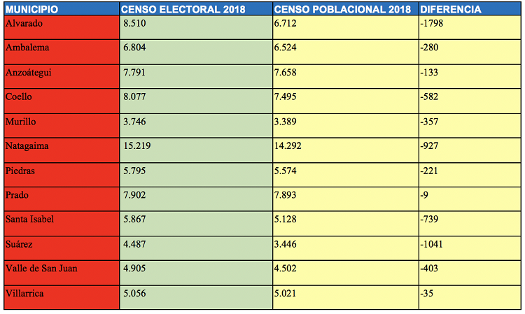 Los datos aportados por la Registraduría Nacional y el Dane, le han permitido a la Universidad del Tolima y la MOE monitorear la inscripción de cédulas para detectar atipicidades que revelen indicativas de trashumancia. En el siguiente cuadro se evidencia la diferencia que corresponde a la restar de la población 2018 menos el censo electoral 2018, la diferencia negativa, traduce más votantes que habitantes. Siendo estos los datos más actualizados de entidades públicas.