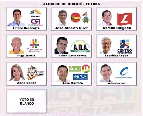En sorteo realizado en la Registraduria Nacional del Estado Civil y con la presencia de los aspirantes a la alcaldía de Ibagué quedó establecido el orden del tarjetón de la siguiente para las elecciones del próximo 27 de octubre en todo el territorio nacional de la siguiente manera:
