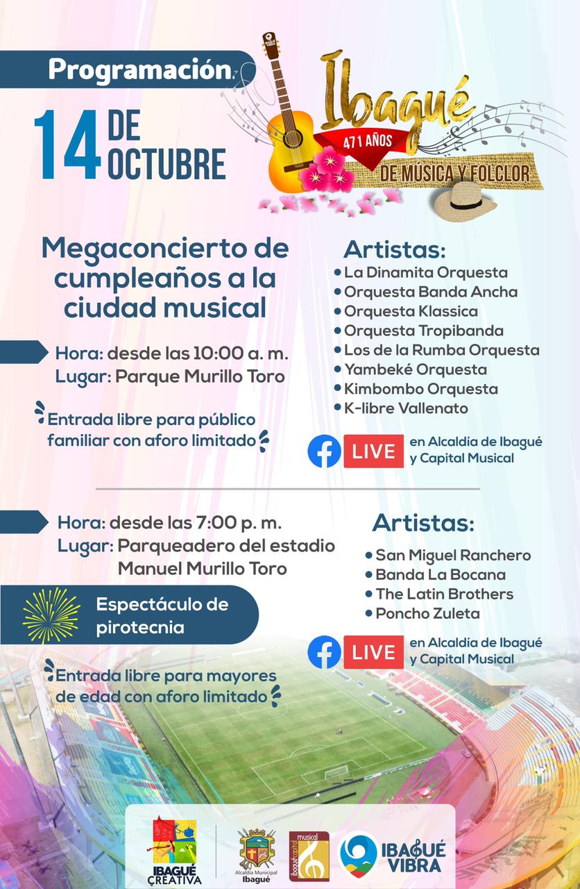 Con el ‘Megaconcierto de cumpleaños a la ciudad musical’, la Alcaldía de Ibagué celebrará los 471 años de fundación del municipio este 14 de octubre. Serán dos actividades gratuitas para los ciudadanos, que involucran al talento local y a tres agrupaciones nacionales.