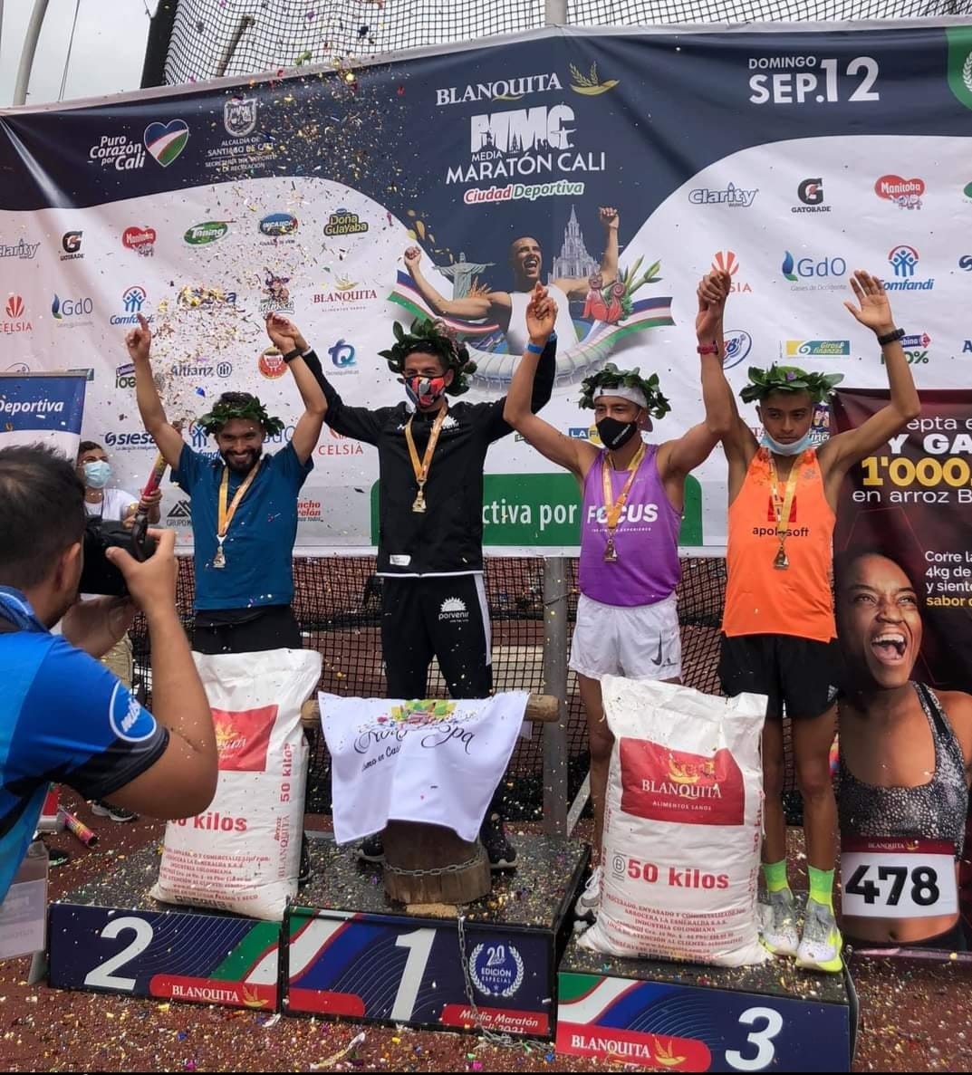 El atleta oriundo del municipio del Líbano, Jeisson Suárez invirtió un tiempo de 1:08:59, en los 21 kilómetros del recorrido que tuvo como punto de inicio el estadio Pascual Guerrero y que finalizó en la pista de atletismo del estadio Pedro Grajales.