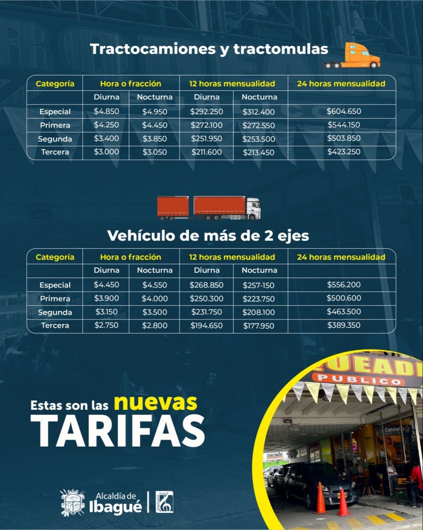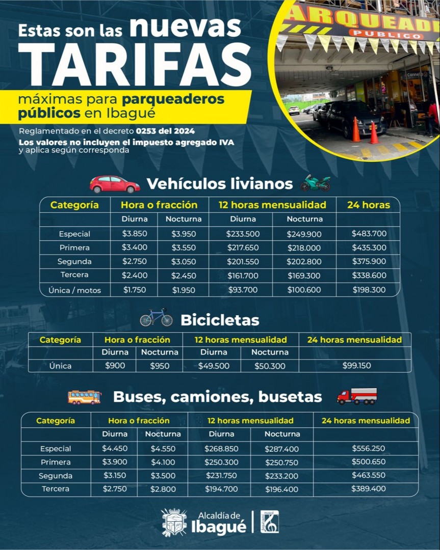 La Alcaldía de Ibagué, a través del decreto 0253 del 2024, estableció las nuevas tarifas máximas que podrán cobrar los parqueaderos públicos de la ciudad, según la categoría, tiempo y tipo de vehículo.