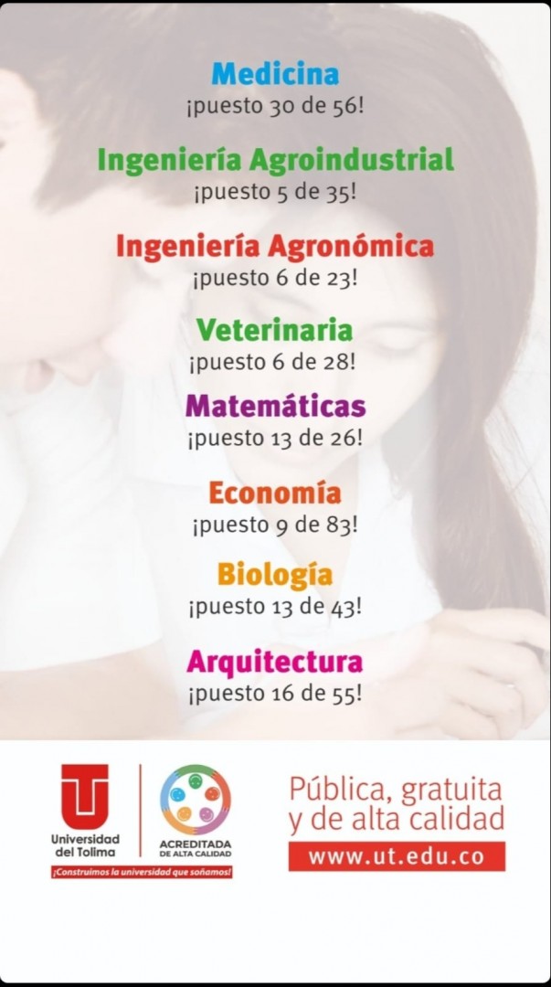 Para la muestra de un botón, este 2024, de acuerdo al ranking de la Revista Dinero de las mejores universidades de Colombia por programa académico, muestran una loable presencia de varias carreras de la Universidad del Tolima entre las mejores del país. El top está basado en los resultados de las pruebas Saber Pro de 2023 y tiene en cuenta el STEM, que hace referencia a las áreas académicas de ciencia, tecnología, ingeniería y matemáticas.