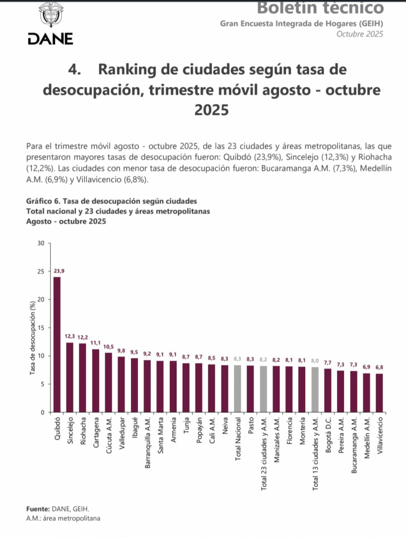 Las ciudades que presentaron mayores tasas de desocupación para este periodo fueron: Quibdó (23,9%) con una diferencia de -2,3 p.p. respecto al mismo periodo del 2024 (26,2%), seguido de Sincelejo (12,3%) y Riohacha (12,2%). Siguen en su orden Cartagena, 11.1%, Cúcuta, 10,5%, Valledupar, 9,8% Ibagué, 9,5%,   Barranquilla, Santa Marta, Armenia, Tunja, Popayán, Cali y Neiva, entre las que están por encima del promedio nacional. En contraste, las ciudades que mostraron menores tasas de desocupación fueron: Villavicencio (6,8%), Medellín A.M. (6,9%), y Bucaramanga A.M. (7,3%).