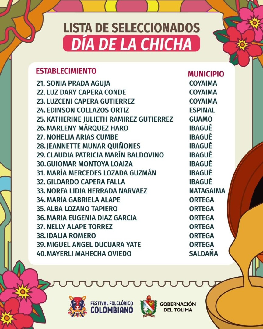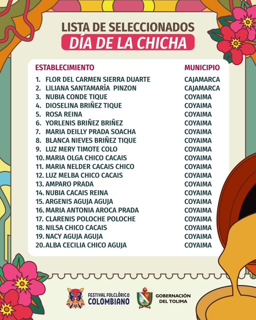 "Dado que solo contamos con 40 cupos disponibles, se llevó a cabo un comité para la selección de los productores de chicha," mencionó el secretario de Cultura y Turismo, Alexander Castro Salcedo. Los criterios de selección incluyeron la diversidad de los municipios representados, asegurando que al menos tres municipios del Tolima estén presentes, según lo estipulado en la ordenanza No. 0010.