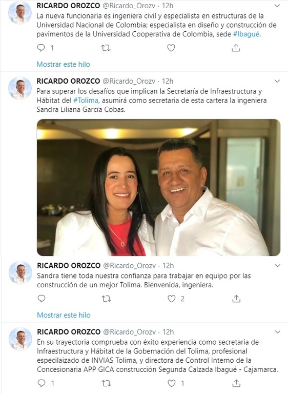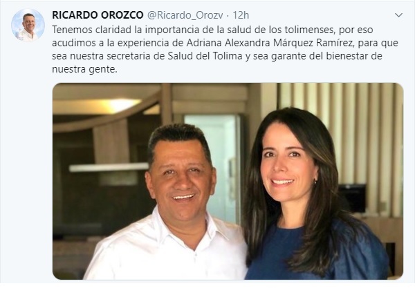 ”Tenemos claridad en la importancia de la salud de los tolimenses, por eso acudimos a la experiencia de Adriana Alexandra Márquez Ramírez", escribió en su cuenta de Twiter el gobernador electo Orozco.