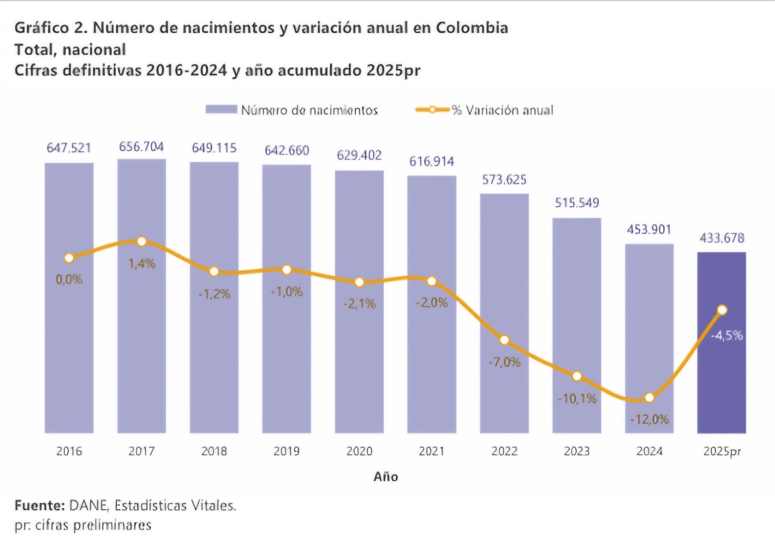 De acuerdo con el informe del DANE sobre estadísticas vitales, en 2025 se registraron 433.678 nacimientos, lo que representa una reducción de 20.223 nacimientos frente a 2024, lo que equivale a 4,5%. Según este reporte, es la cifra más baja en nacimientos de los últimos 10 años.