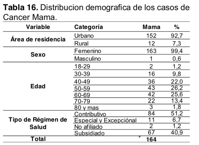 En la semana epidemiológica 32, el 92,7% de los casos de Cáncer de Mama son residentes del area urbana; el 26,2% de pacientes está entre los 50 a 59 años de edad y el 51,2% se encuentran afiliados al régimen contributivo.