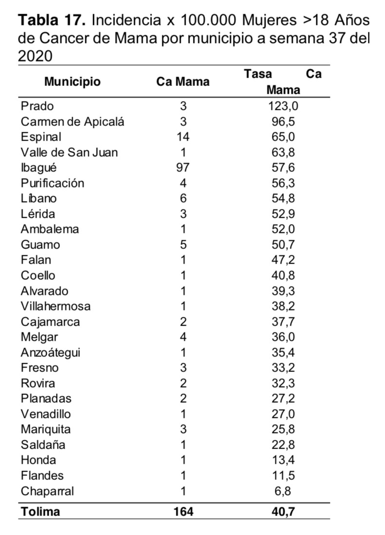 El municipio con mayor incidencia de casos es Prado que a pesar de reportar solo 3 casos, por el número de habitantes 100.000 se convierte en materia de estudio para las autoridades locales que deben realizar mayores programas de promoción de la salud. Le sigue Carmen de Apicalá con 3 casos y El Espinal con 14. Ibagué reportó 97 casos.