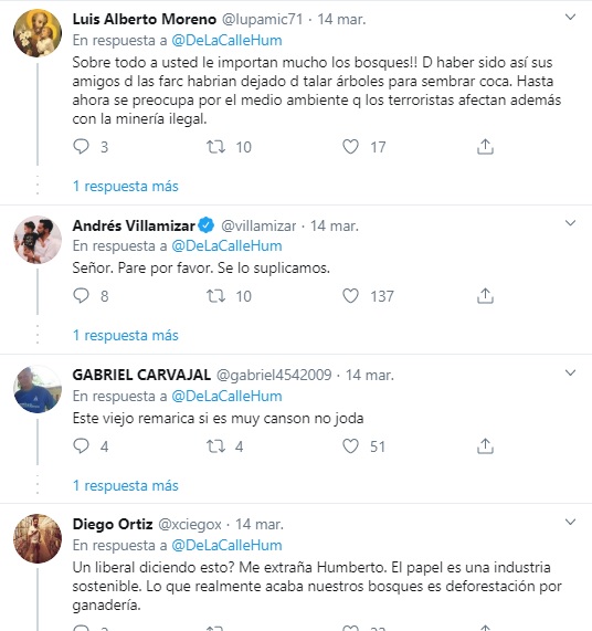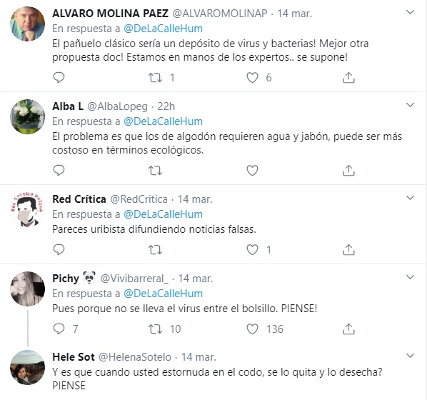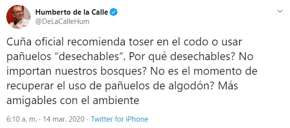 “Cuña oficial recomienda toser en el codo o usar pañuelos “desechables”. Por qué desechables? No importan nuestros bosques?. No es el momento de recuperar el uso de pañuelos de algodón? Más amigables con el ambiente.” Dijo Humberto de la Calle a través de un trino hablando sobre medidas preventivas frente a la pandemia del coronavirus.