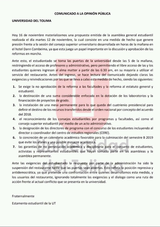 Entre tanto, aún no se conoce un pronunciamiento oficial por parte de la UT. Sin embargo, hace menos de 24 horas la institución emitió un comunicado en el que invita a los miembros del movimiento estudiantil "al diálogo y a un ejercicio argumentativo con el que sigamos construyendo ese modelo de país, y especialmente, esa Universidad que tanto anhelamos".
