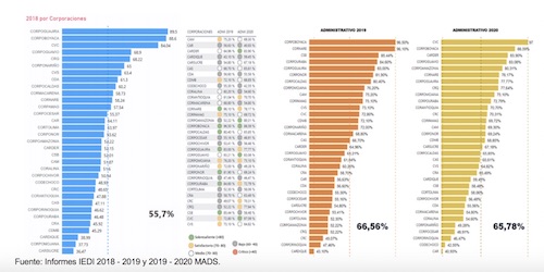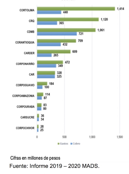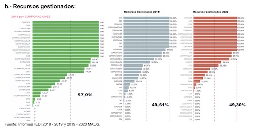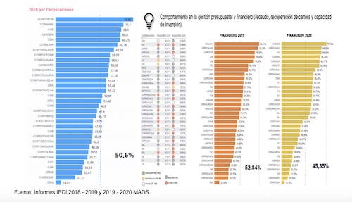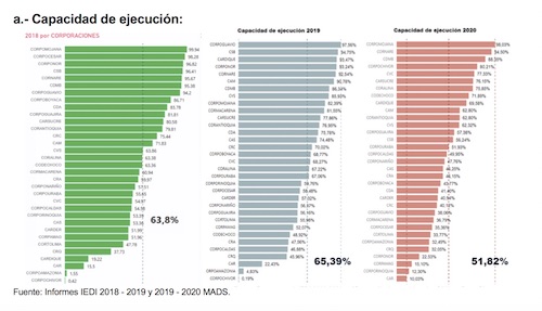 En 2018 la capacidad de ejecucion fue del 47,78%, en 2019 sube al 55,98% y al 2020 cae estripitosamente a un 33,77%, demostrandose asi la poca capacidad de inversion ambiental en 2020. Ello implica un factor para que la Contraloría general de la república no fenesca la cuenta fiscal de dicha vigencia.