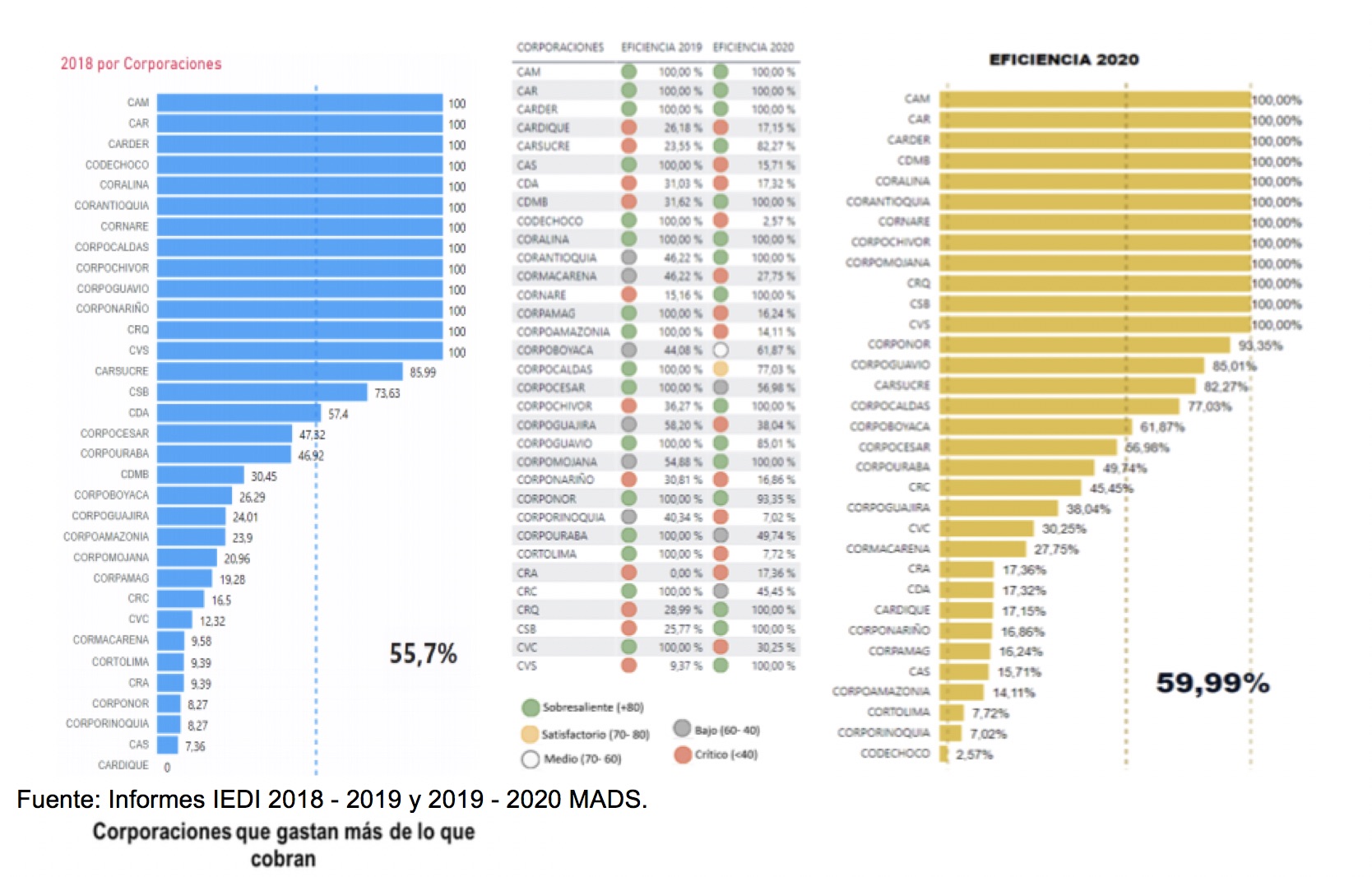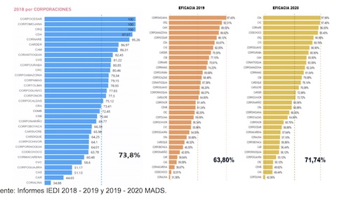 En términos de eficiencia entendida como el mínimo costo que se emplea para evaluación de tramites, en 2018 se inició con un 9,39% al 2019 obtuvo una eficiencia del 100% y ya para 2020 la eficiencia se reduce al 7,72% superando solo a Corporinoquia y Codechoco.