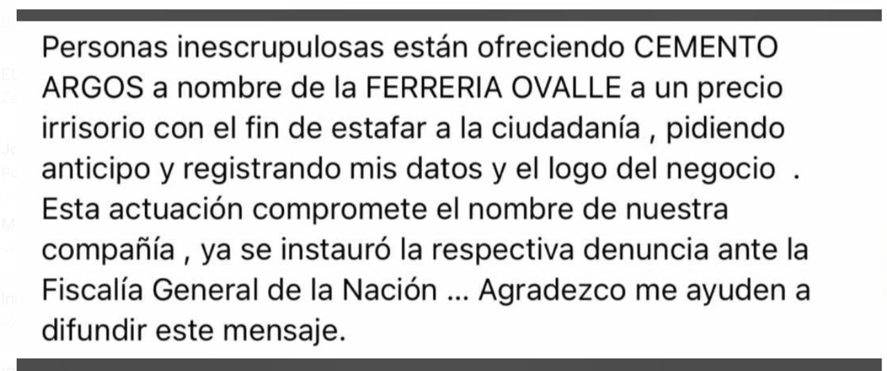 Un llamado a compradores de cemento especialmente realizó hoy los propietarios de la ferretería Ovalle, organización que denunció ya ante la Fiscalía General de la Nación el grave hecho de vender este material para construcción con facturas falsas, generando así perjuicios directos para los empresarios y para quienes de buena fe luego referencian ante la Dian las transacciones.
