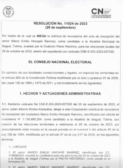 El candidato mostró además el fallo del CNE, en el que se confirma que el asunto ya fue resuelto. Aunque su padre ocupa la presidencia de Coljuegos, un cargo del orden nacional, la elección a la Cámara de Representantes se realiza por circunscripciones regionales. Al no coincidir los ámbitos de autoridad —condición necesaria para que opere la causal de inhabilidad según la Constitución—, el vínculo familiar no representa un impedimento legal para su aspiración.