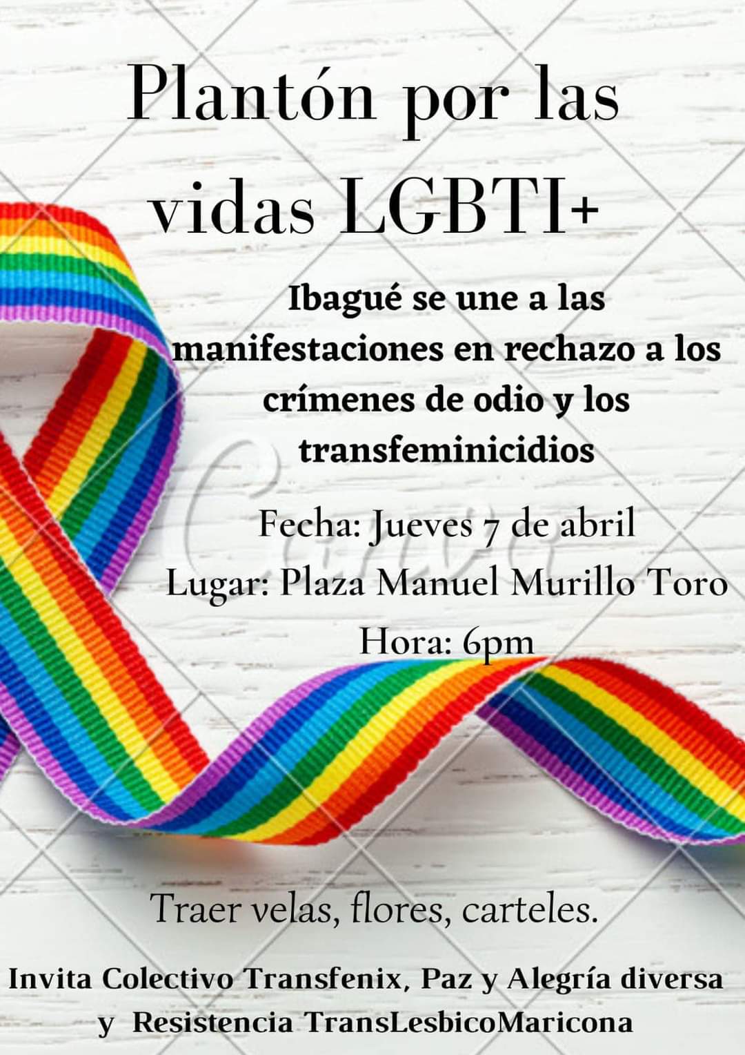Desde los colectivos, Paz y alegría diversa, Colectivo Transfenix y Resistencia TransLesbicoMaricona se convocó para este jueves 07 de abril, a las 6:00 pm en la Plaza Manuel Murillo Toro, un plantón por las vidas LGBTIQ+