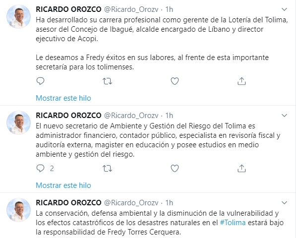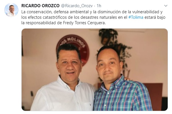 ”La conservación, defensa ambiental y la disminución de la vulnerabilidad y los efectos catastróficos de los desastres naturales en el Tolima estarán bajo su responsabilidad. Le deseamos a Fredy éxitos en sus labores, al frente de esta importante secretaría para los tolimenses”, afirmó Ricardo Orozco, gobernador electo.