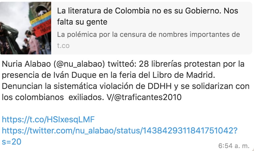 Las listas negras de autores y autoras, no olvidemos, son solo la punta del iceberg de un país donde decenas de chicos y chicas que estaban en las protestas han sido desaparecidos, torturadas, violadas, perseguidos, estigmatizadas o directamente asesinados. Más de cinco millones de colombianas y colombianos han sufrido desplazamientos forzosos. Solo en el mes pasado, más de cinco mil han engrosado la lista. “La gente no se va porque hay violencia, sino que se genera violencia para que la gente se vaya”, reflexionó hace años un exiliado del hermano país. En Colombia se sigue generando violencia contra su pueblo y el gobierno de Iván Duque no ha dudado en socavar los débiles cimientos de los Acuerdos de Paz en los que gran parte de la población colombiana había centrado sus esperanzas de un futuro mejor.