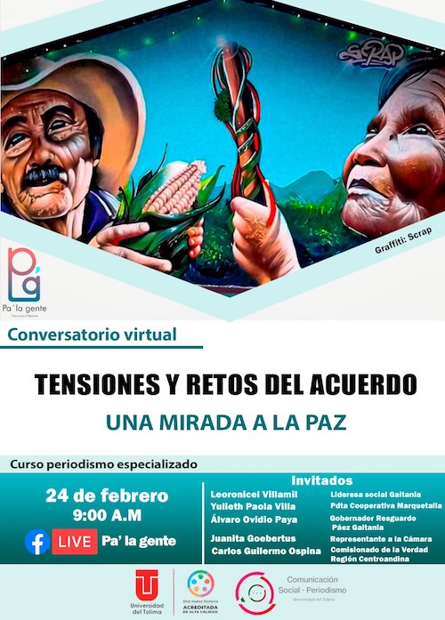 El programa de Comunicación Social y Periodismo de la Universidad del Tolima, consciente de la responsabilidad de aportar a la formación del capital profesional que en el presente y futuro tendrá que ver con las dinámicas de desarrollo de la región, ha acompañado a las comunidades en la búsqueda de escenarios comunes para la construcción de paz desde los territorios, a ese propósito se suma el conversatorio virtual "Tensiones y retos del acuerdo: una mirada a la paz’’, espacio que propone una reflexión en torno a la dinámica que ha tenido la etapa de implementación, así como los propósitos a futuro que la sociedad colombiana tienen con la paz.