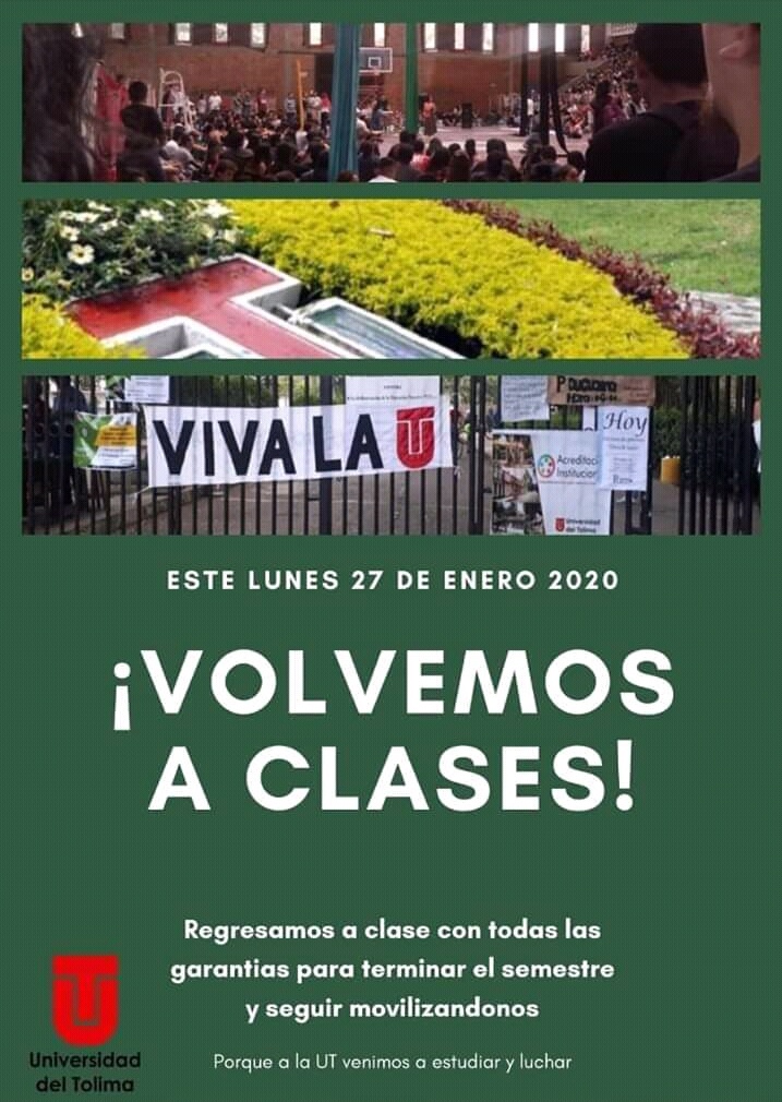 A través de comunicado, las directivas de la U.T. informan que luego de varios escenarios de diálogo entre estudiantes, profesores y directivos, en los cuales se abordaron algunas solicitudes del estamento estudiantil, así como de los docentes de cátedra, se determinó la reanudación de clases este lunes 26 de enero.