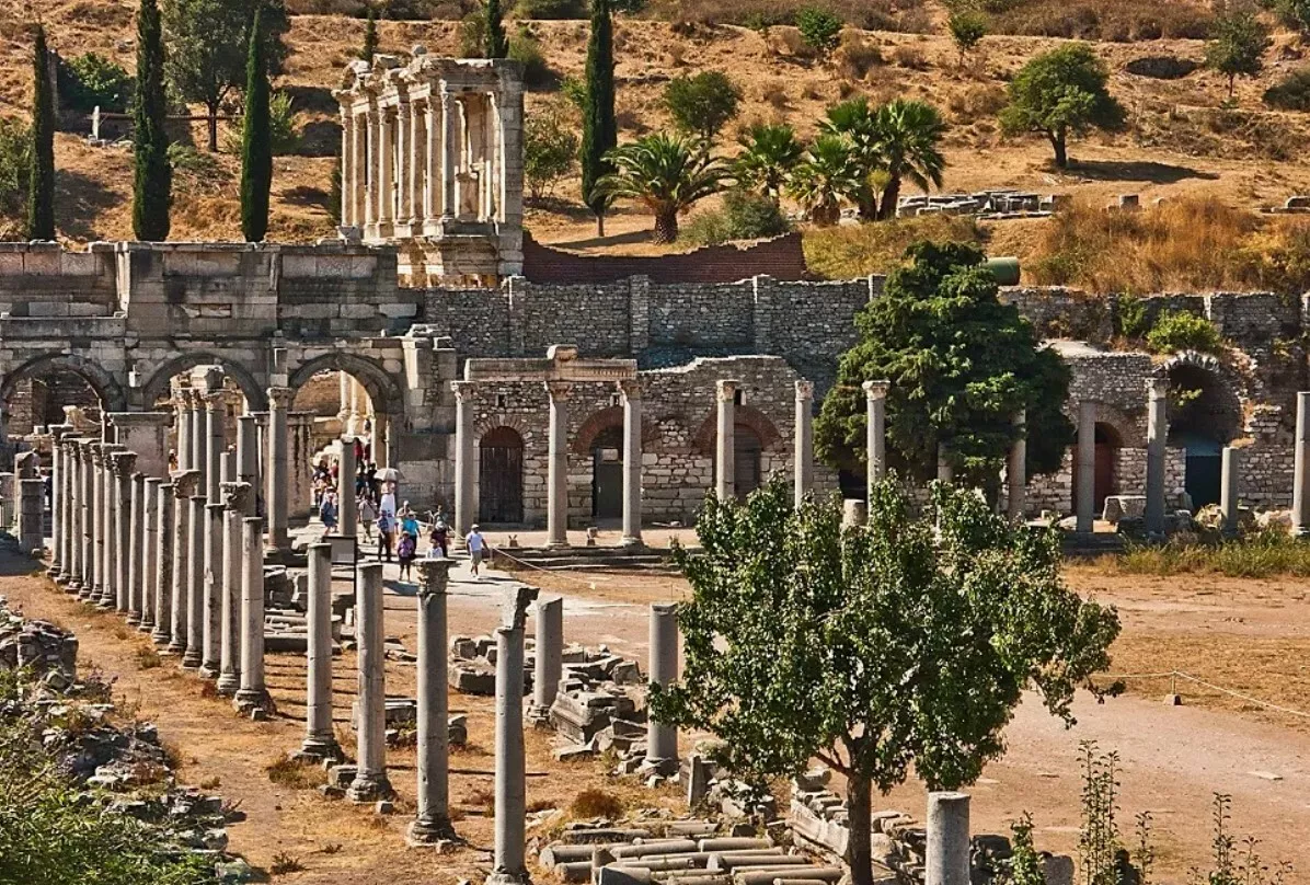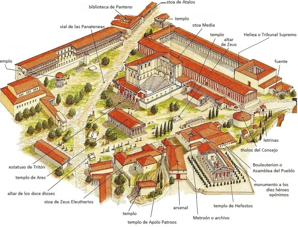 Recreación e imagen parcial del ágora en Efesos, Turquia. Fuente: https://www.glosarioarquitectonico.com/glossary/agora/