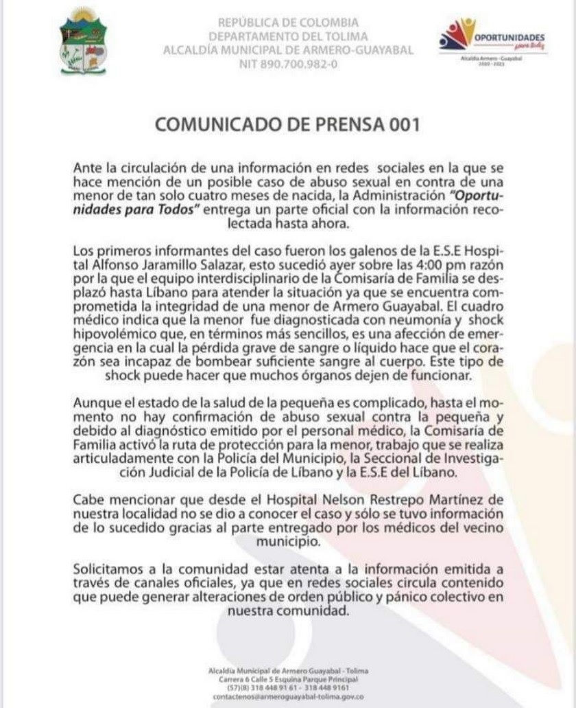 Una vez tuvo conocimiento del caso por parte de la Comisaría de Familia, el ICBF articuló con el sector salud la atención para la bebé en el hospital Alfonso Jaramillo Salazar del municipio de Líbano. Allí todavía se encuentra internada la pequeña, a la espera de que los profesionales de la salud confirmen o desmientan si fue abusada sexualmente.