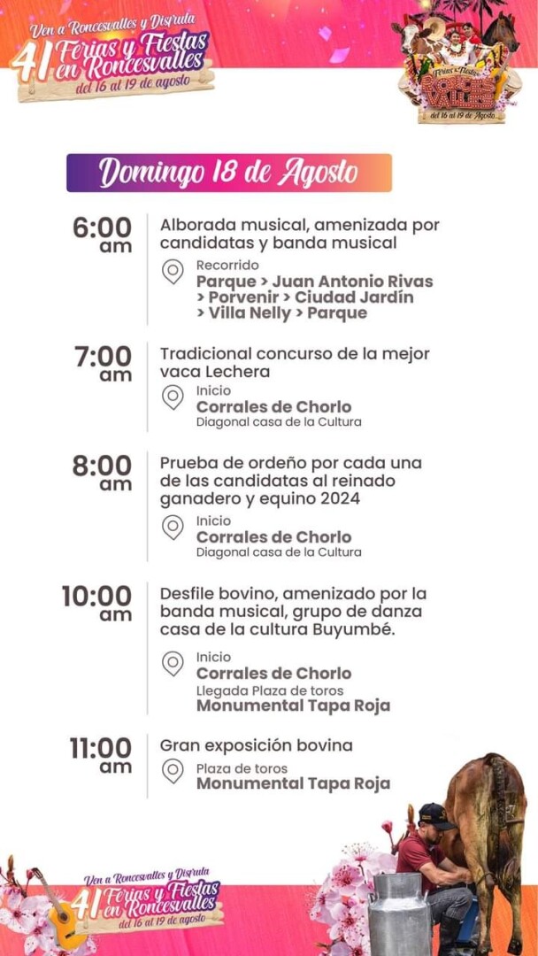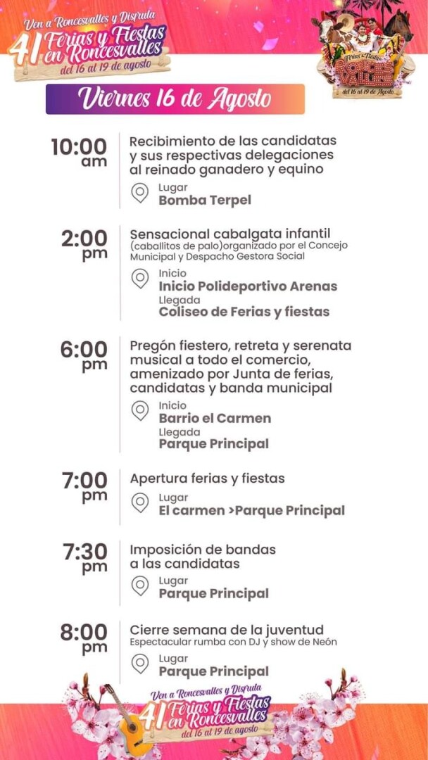 El evento principal, el Reinado Ganadero y Equino, servirá para exaltar la belleza y talento de las mujeres roncesvallenses, además de resaltar la importancia de la ganadería y la agricultura en la economía de este municipio.