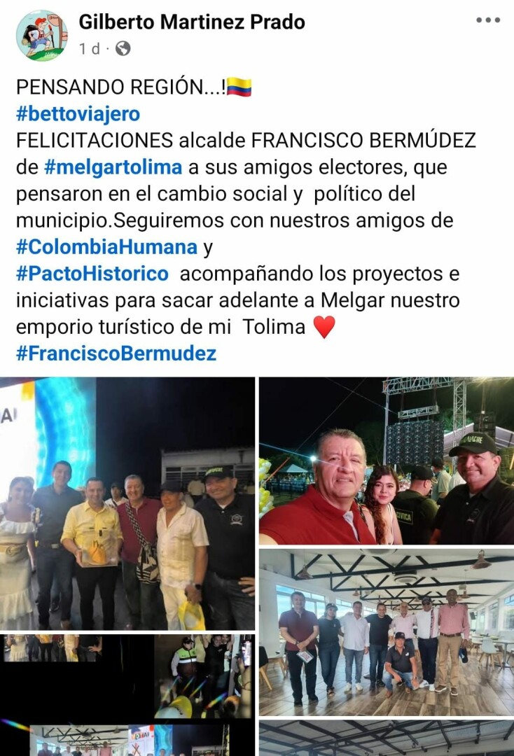 "Felicitaciones, señor alcalde Francisco Bermúdez, a sus amigos electores que pensaron en el cambio social y político del municipio. Seguiremos con nuestros amigos de Colombia Humana y Pacto Histórico acompañando los proyectos e iniciativas para sacar adelante a Melgar, nuestro emporio turístico de mi Tolima", escribió Martínez Prado.