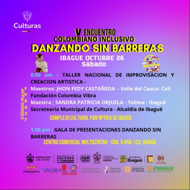 El V Encuentro colombiano inclusivo ‘Danzando Sin Barreras’ es un proyecto ganador de la convocatoria de Concertación Cultural del Ministerio de las Culturas y organizado por la Fundación Talentos. Su objetivo es visibilizar los diferentes talentos artísticos de niños, jóvenes y adultos en condición de discapacidad de Ibagué.