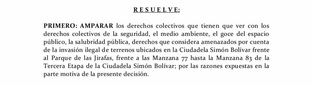 En el fallo del pasado 19 de junio, el magistrado John Libardo Andrade Flórez accedió a proteger los derechos de la comunidad a la seguridad, el medio ambiente, el goce del espacio público y la salubridad pública, que considera amenazados por el asentamiento ilegal ubicado en un predio del Municipio, que va desde la manzana 77 hasta la 83 del barrio Ciudadela Simón Bolívar.