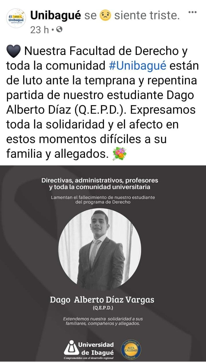"Nuestra Facultad de Derecho y toda la comunidad de Unibagué están de luto ante la temprana y repentina partida de nuestro estudiante Dago Alberto Díaz (Q.E.P.D.). Expresamos toda la solidaridad y afecto a su familia y allegados", escribió en un comunicado la Universidad.