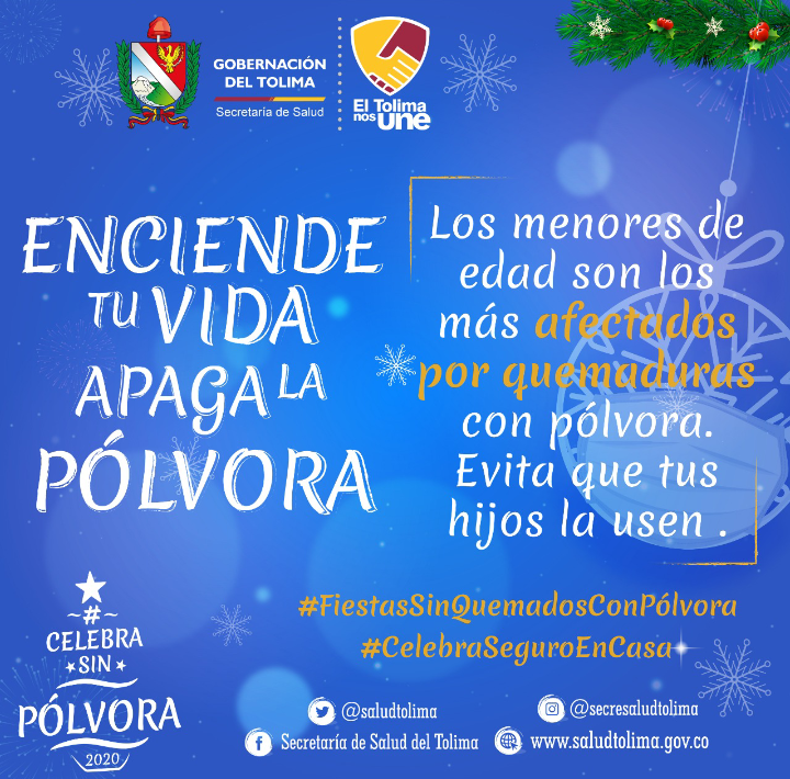 Asimismo, la estrategia del gobierno departamental “Enciende tu vida, apaga la pólvora”, hace la invitación a celebrar la navidad sin la manipulación de pólvora, teniendo en cuenta que el Tolima no cuenta con un pabellón especial de atención para los lesionados.
