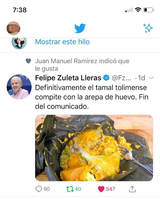 El conocido periodista Felipe Zuleta Lleras, nieto del expresidente Alberto Lleras Camargo, escribió un twee en el que exaltó el tamal tolimense. Dice de este plato típico que compite con la famosa arepa de huevo.