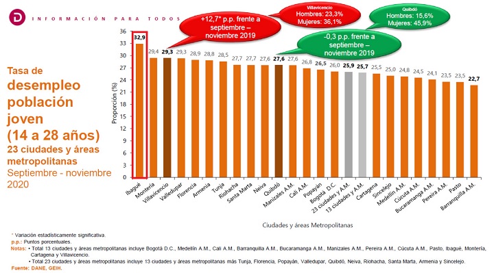En cuanto a la franja de jóvenes, Ibagué ocupó el primer lugar de desempleo con una cifra preocupante: 32.9%. Le siguen Montería con 29.4%; Villavicencio, 29.3%; Valledupar, 29.3%; Florencia, 28.9%; Armenia, 28.8% y Tunja, 28.5%.