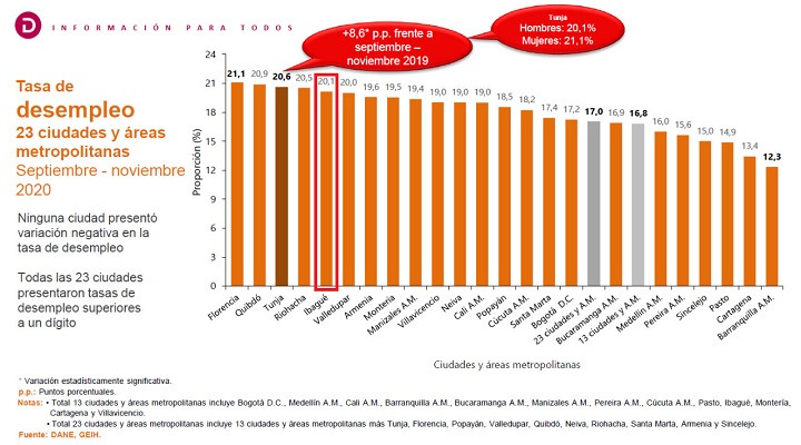 Florencia, 21.1%; Quibdó, 20.9%; Tunja, 20.6%; Riohacha, 20.5%; Ibagué, 20.1%; Valledupar, 20.0% y Amenia, 19.6%.