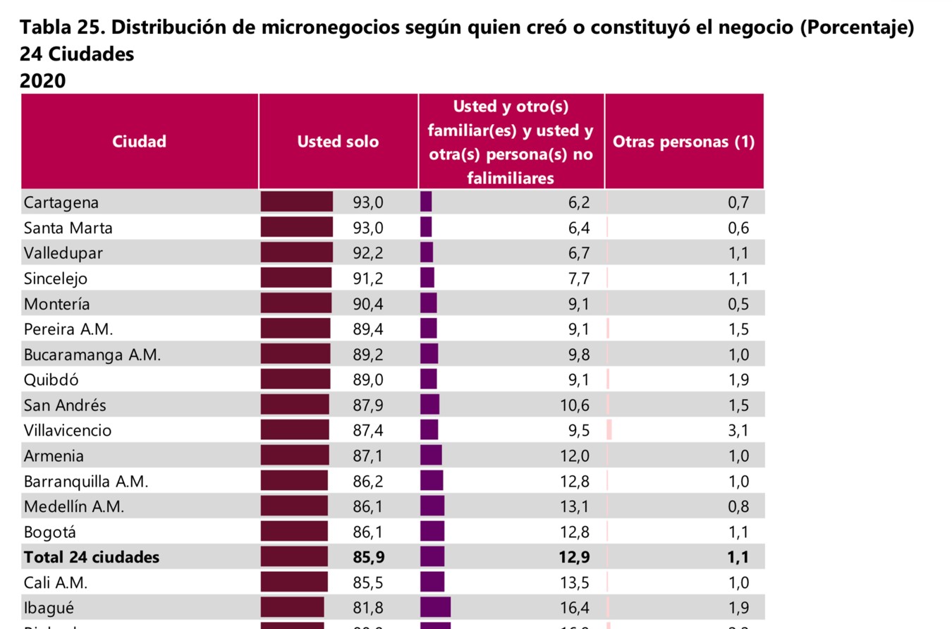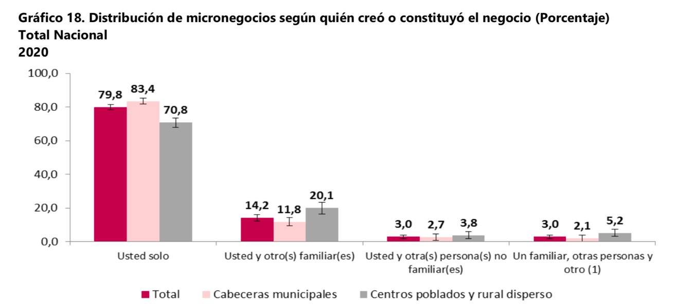 En el 2020, la Encuesta de Micronegocios estimó que el 79,8% de micronegocios a nivel nacional fue creado o constituido por su propietario, el 14,2% se creó en compañía de otro(s) familiar(es), el 3,0% junto a otra(s) persona(s) no familiar(es), el 2,2% manifestó que este fue creado por un familiar y el 0,8% reportó que fue constituido por otras personas. Se resalta la cantidad de micronegocios creados únicamente por el propietario en las cabeceras municipales (83,4%) y de micronegocios creados junto a otro(s) familiar(es) (20,1%) en los centros poblados y rural disperso (Cuadro C.1 - Total nacional).
