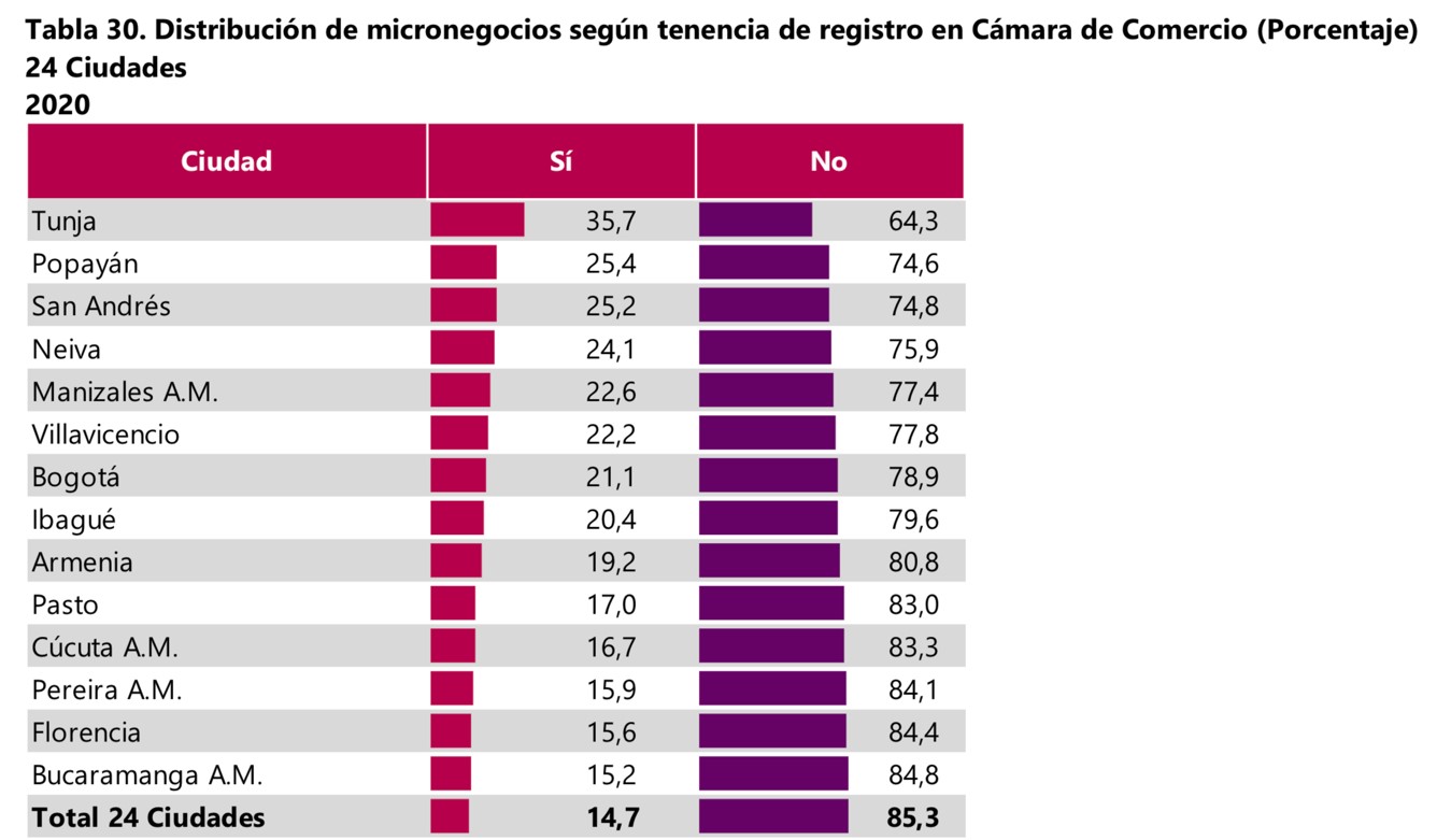 En 2020, la mayor parte de micronegocios (85,3%) de las 24 ciudades no realizó el registro en Cámara de Comercio, es decir, solo el 14,7% de dichas unidades económicas tuvieron registro en Cámara de Comercio. Las mayores proporciones de tenencia de registro en Cámara de Comercio se encontraron, en su orden, en: Tunja (35,7%), Popayán (25,4%), San Andrés (25,2%), Neiva (24,1%) y Manizales A.M. (22,6%). Por su parte, las ciudades que concentraron las menores proporciones de tenencia de dicho registro fueron: Cartagena (3,7%), Montería (6,1%), Sincelejo (6,7%), Santa Marta (7,4%) y Riohacha (7,9%) (Cuadro F.6 - Anexo 24 Ciudades).
