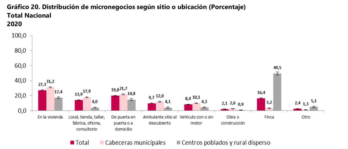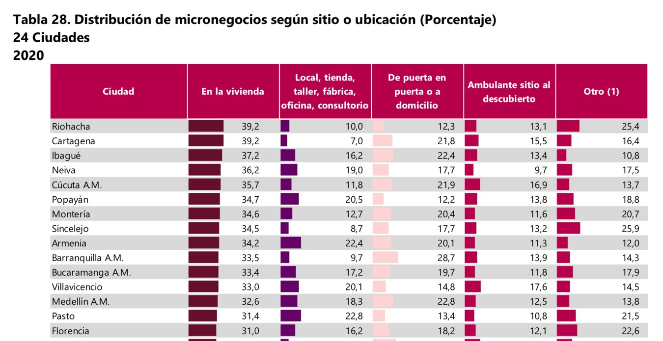 En las 24 ciudades principales, el 30,6% de micronegocios operó en la vivienda en el 2020; el 17,1% funcionó en local, tienda, taller, fábrica, oficina o consultorio; el 23,8% de micronegocios desarrolló su actividad puerta a puerta o a domicilio y el 14,0% realizó su actividad de manera ambulante o en un sitio al descubierto. La mayor proporción de micronegocios que operaron en la vivienda se encontró en: Riohacha (39,2%), Cartagena (39,2%), Ibagué (37,2%), Neiva (36,2%) y Cúcuta A.M. (35,7%). Las ciudades que concentraron mayor proporción de micronegocios en local, tienda, taller, fábrica, oficina o consultorio, en su orden, fueron: Tunja (34,7%), Manizales A.M. (23,0%), Bogotá (22,8%), Pasto (22,8%) y San Andrés (22,7%). (Cuadro D.1 - Anexo 24 Ciudades).