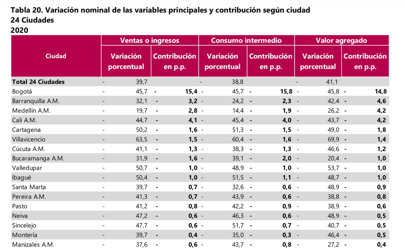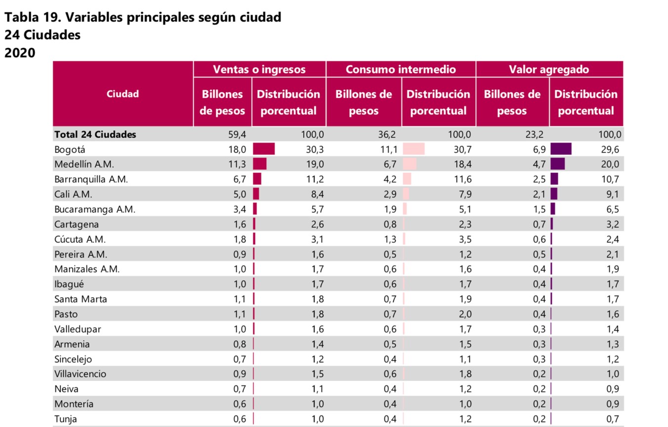 En las 24 ciudades principales y áreas metropolitanas, los 2.436.291 micronegocios, estimados en el 2020, registraron un ingreso de $59,4 billones, un consumo intermedio de $36,2 billones y un valor agregado de $23,2 billones de pesos. Las ciudades que tuvieron una mayor participación en el valor agregado total fueron: Bogotá (29,6%); Medellín A.M. (20,0%); Barranquilla A.M. (10,7%); Cali A.M. (9,1%); y Bucaramanga A.M. (6,5%). Por su parte, las ciudades que menos aportaron al valor agregado total fueron: Quibdó (0,2%); San Andrés (0,2%); Florencia (0,5%); Riohacha (0,5%); y Popayán (0,6%). (Cuadro I.1_24C – Anexo 24 ciudades)