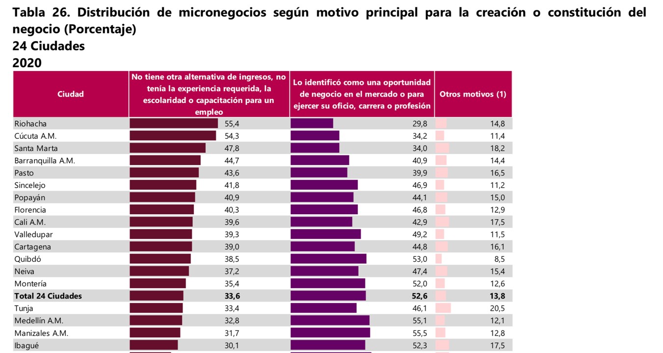 Con respecto al motivo principal para la creación o constitución del micronegocio, se observa que el 33,6% de propietarios(as) reportaron no tener otra alternativa de ingresos o la experiencia requerida, la escolaridad o capacitación para un empleo durante el 2020; el 52,6% expresó que lo identificó como una oportunidad de negocio en el mercado o una forma de ejercer su oficio, carrera o profesión y el 13,8% adujo otros motivos para la creación negocio (Cuadro C.2 - Anexo 24 Ciudades).