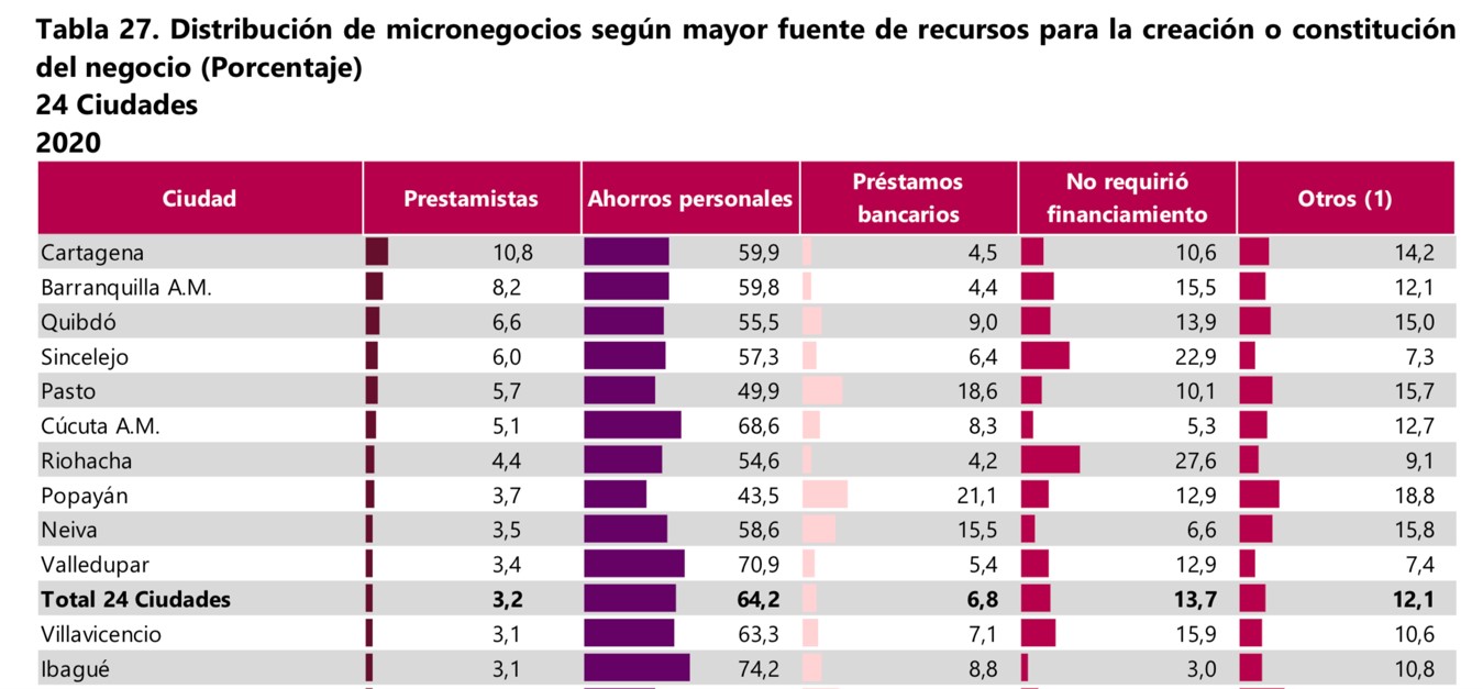 Para el 64,2% de propietarios(as) de micronegocios en las 24 ciudades durante el 2020, el ahorro personal fue la mayor fuente de recursos para la creación o constitución del negocio. El 13,7% de dueños(as) no requirió financiación, el 6,8% de dueños(as) recurrió a préstamos bancarios, el 3,2% lo hizo a través de prestamistas y el 12,1% creó el negocio con recursos de otras fuentes. La mayor proporción de micronegocios creados con ahorros personales del propietario, se presentó en la ciudad de Montería (83,6%), seguida por San Andrés (77,3%), Ibagué (74,2%), Santa Marta (72,2%) y Valledupar 70,9% (Cuadro C.4 Anexo 24 Ciudades).