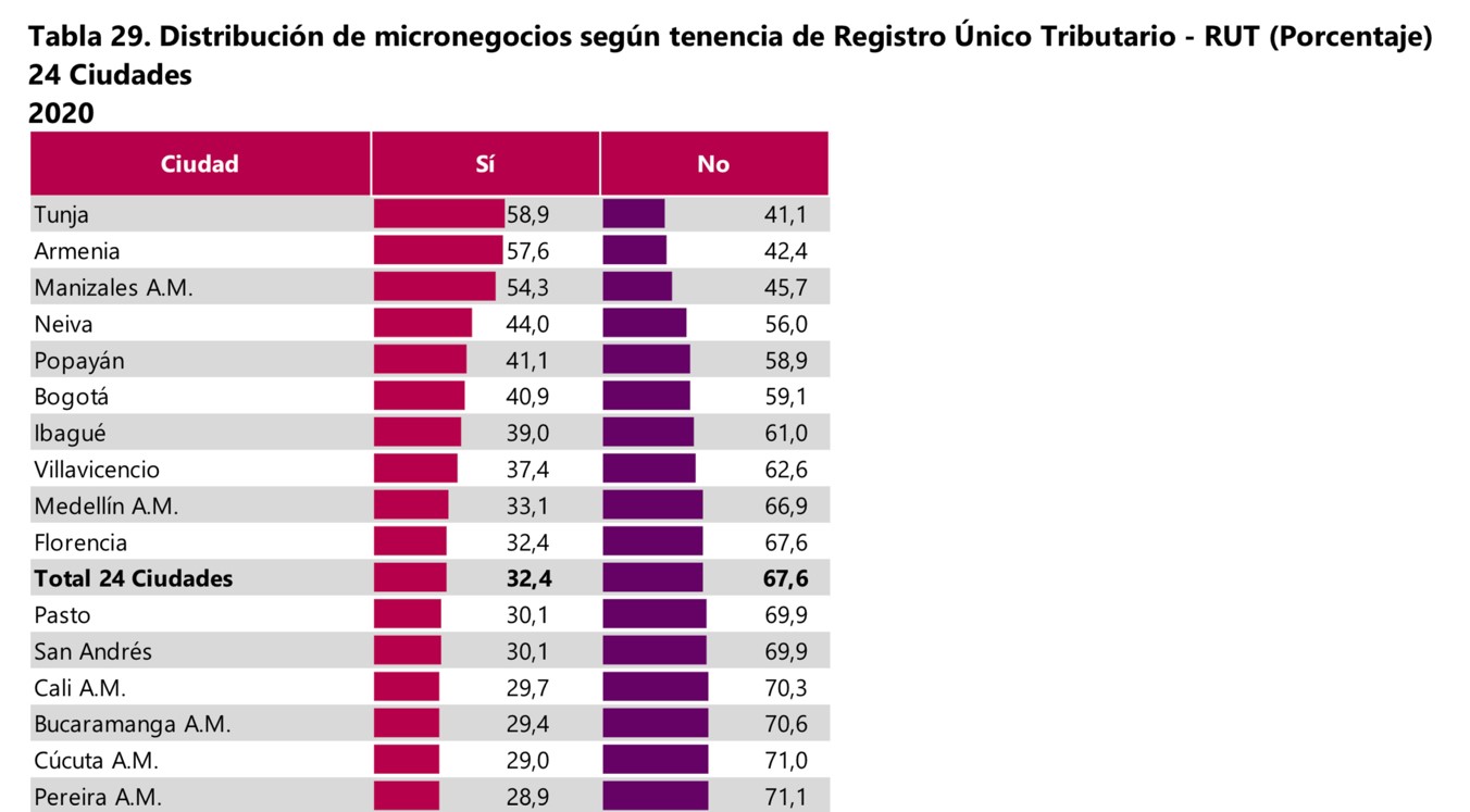 Formalidad de entrada : Respecto a la formalidad de entrada, el 32,4% de micronegocios de las 24 ciudades tenían el Registro Único Tributario (RUT). Las mayores proporciones de micronegocios con dicho registro se encontraron, en su orden, en: Tunja (58,9%), Armenia (57,6%), Manizales A.M. (54,3%), Neiva (44,0%) y Popayán (41,1%). Las ciudades que concentraron las menores proporciones de tenencia de dicho registro fueron: Cartagena (6,4%), Quibdó (10,3%), Montería (11,1%), Riohacha (13,9%) y Sincelejo (14,6%) (Cuadro F.1 - Anexo 24 Ciudades).