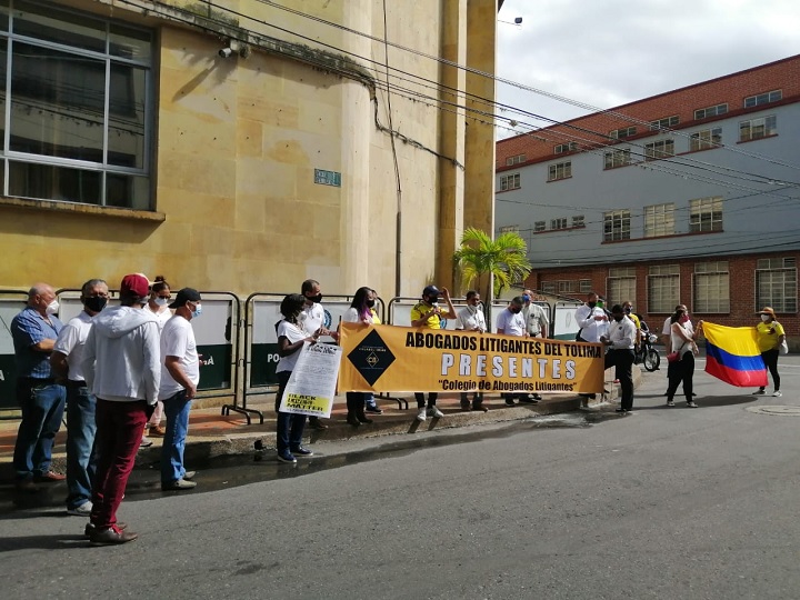 A esta hora frente al Palacio de Justicia de Ibagué, Alfonso Reyes Echandía, un grupo de abogados litigantes adelanta un plantón para exigir mejores condiciones laborales. La protesta de los profesionales afiliados al Colegio De Abogados Litigantes (COLABOL ON LINE), responde a una convocatoria nacional que realizó el Sindicato de Abogados Litigantes de Colombia y la Federación de Colegios de Abogados Litigantes.