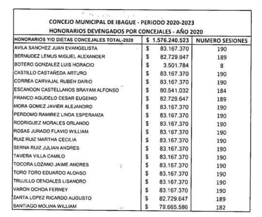 “En el 2020 en promedio cada uno de los 19 concejales de Ibagué, por honorarios, de acuerdo con las sesiones laboradas, 150 ordinarias y 40 extraordinarias, recibió $83’167.370.oo. es decir, si ese monto se divide por 12 meses, arroja $6’930.614 mensuales. Una cifra no despreciable para una ciudad como Ibagué”.