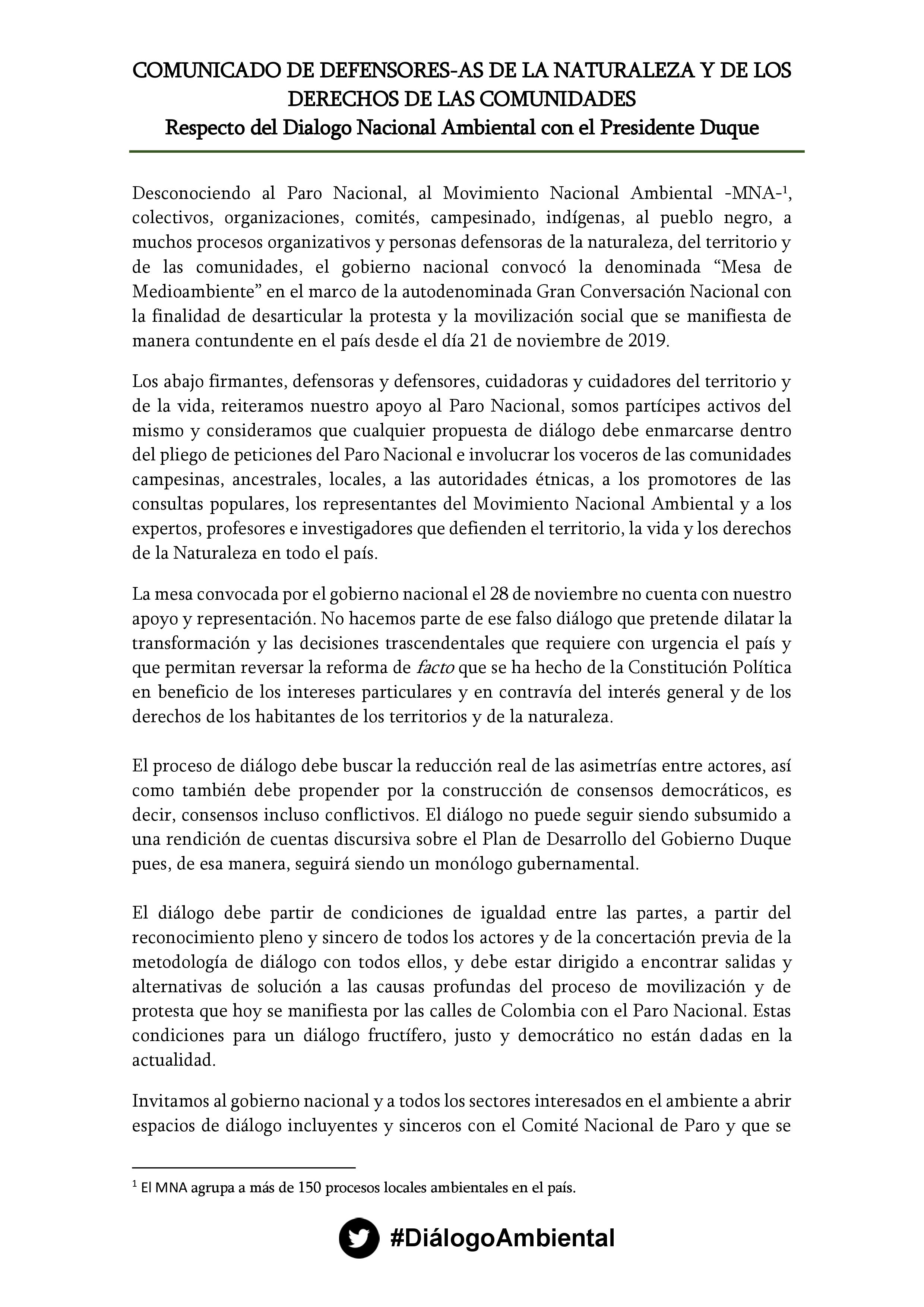 A través de un comunicado firmado por cerca de 600 líderes y lideresas, académicos y organizaciones socio-ambientales exigen que cualquier propuesta de diálogo con el gobierno se enmarque dentro del proceso del Paro Nacional e involucre a todos los actores que defienden el territorio, la vida y los derechos de la Naturaleza en todo el país.