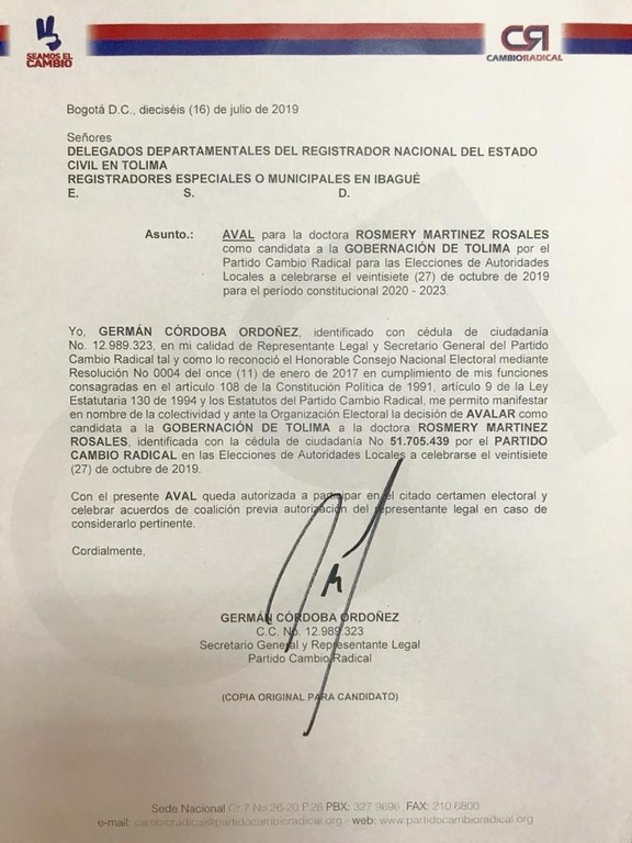Aunque, al momento de escribir esta nota no se conocían los resultados de la encuesta que adelanto el Centro Nacional de Consultoría, lo cierto es que existe un comunicado firmado por Germán Córdoba Ordoñez, secretario General y Representante Legal de Cambio Radical, donde le otorga el aval de Rosmery Martínez, y además la autoriza a participar en acuerdos y coaliciones con otros partidos y movimientos con el objetivo de lograr un conjunto de fuerzas a su favor que permitan opciones de triunfo. Es de anotar, que dos sondeos que realizaron emisoras locales de Ibagué sobre favoritismo entre la señora Rosmery y Orozco, ambos también los ganó la excongresista tolimense