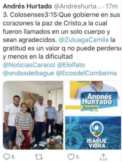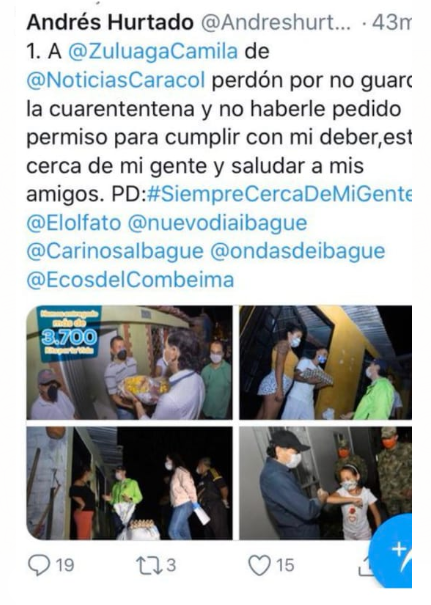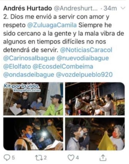 Más que infortunados la seguidilla de mensajes que en su cuenta de twiter ha escrito en las últimas horas el alcalde de Ibagué, Andrés Fabián Hurtado en reacción a la crítica que en el noticiero de Caracol TV le hicieron por no dar el ejemplo que, en su condición de mandatario y líder de una comunidad, está en la obligación de brindar.
