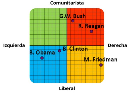 Comunitarismo de derecha (Conservadurismo): Los individuos en este cuadrante tratan de conservar el orden social y económico tradicional y de defender la soberanía del Estado. Tienden a verse a sí mismos como los defensores de lo que sus antepasados hubieran querido, favoreciendo leyes de inmigración estrictas, valores tradicionales y un sector militar fuerte. Aunque normalmente consideran que el Estado tiene un papel en los asuntos de seguridad y cultura nacional, tienden a ser más escépticos sobre la participación del Estado en la economía.
